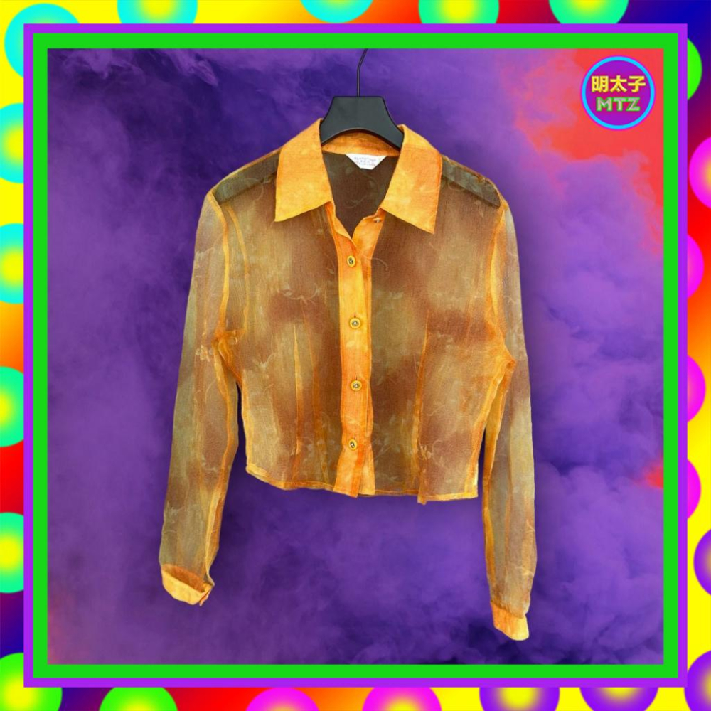 二手 橘色 薄紗 印花 微挺 顆粒感 寬身 略彈性 長袖 襯衫 F920 【明太子 古著應召站】