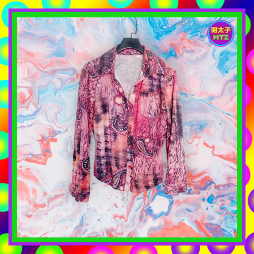 二手 桃粉紅 印花 彈性 微珠光 長袖 襯衫 F913 【明太子 古著應召站】