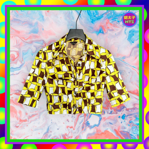 二手 MISSHATO 咖黃白配色 印花 略亮面 微挺 彈性 短版 短袖 襯衫 F913 【明太子 古著應召站】