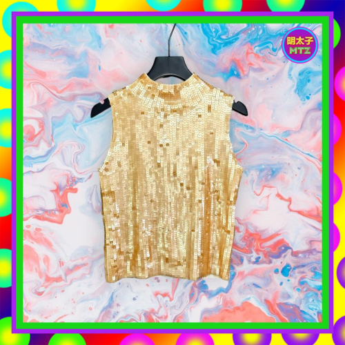 二手 BERNINI 棕色 滿版亮片 微厚 高彈性 立領 背心 F913B 【明太子 古著應召站】