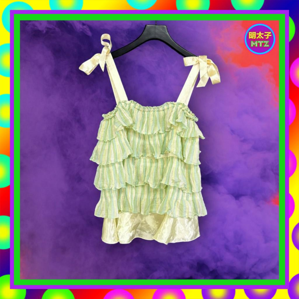 二手 BIGI 粉黃綠配色 緞面 拼接 條紋 緞帶 層次 鬆緊領 背心 F911 【明太子 古著應召站】