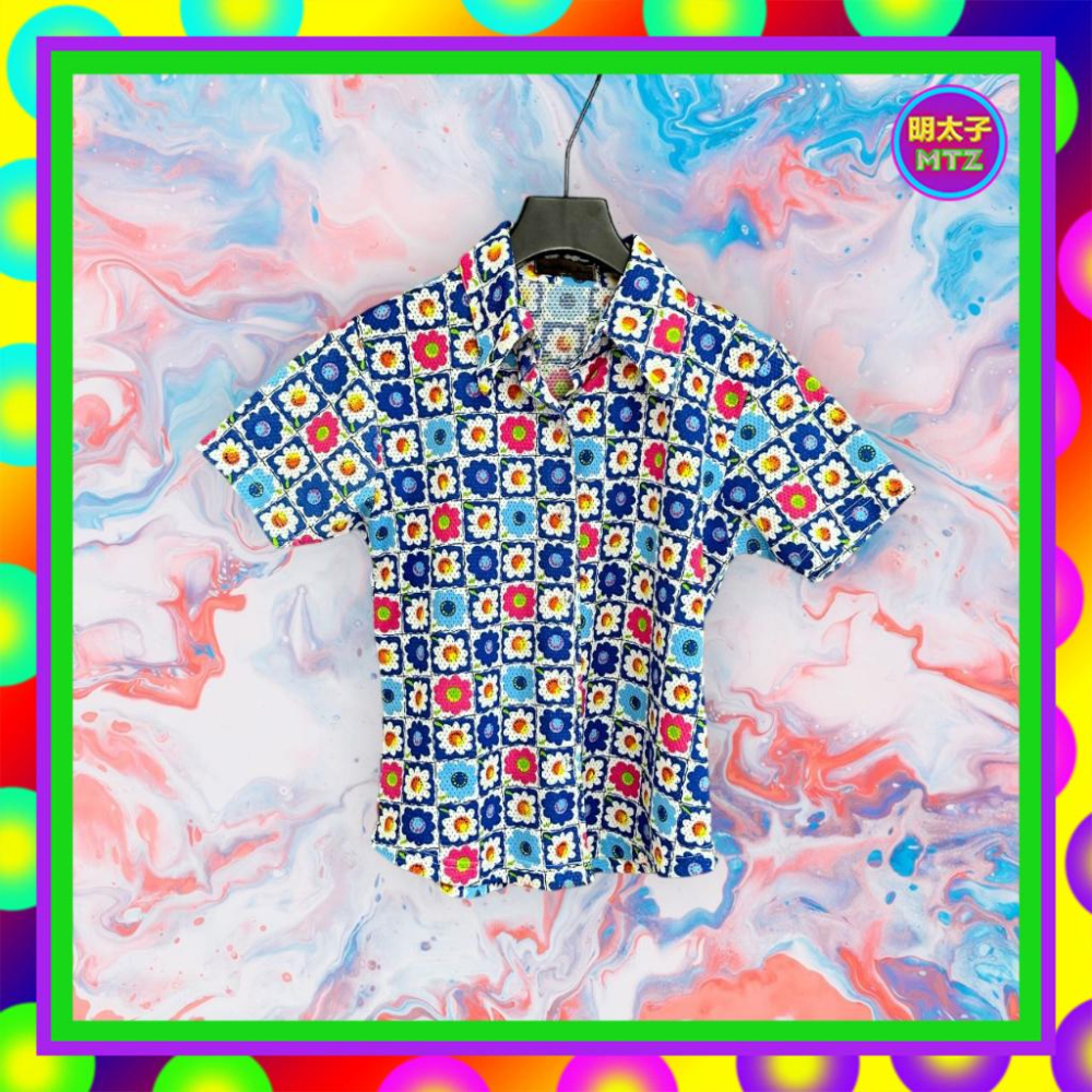 二手 FASHION BOY 藍色 彩色印花 洞洞布 彈性 微挺 短袖 襯衫 F817 【明太子 古著應召站】