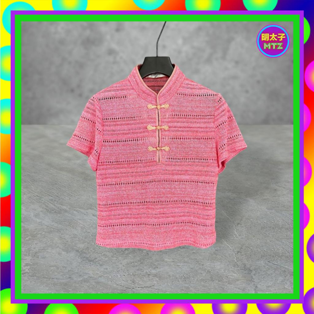 二手 暗粉紅色 針織 略鏤空 彈性 旗袍領 中短版 短袖 襯衫 F804 【明太子 古著應召站】