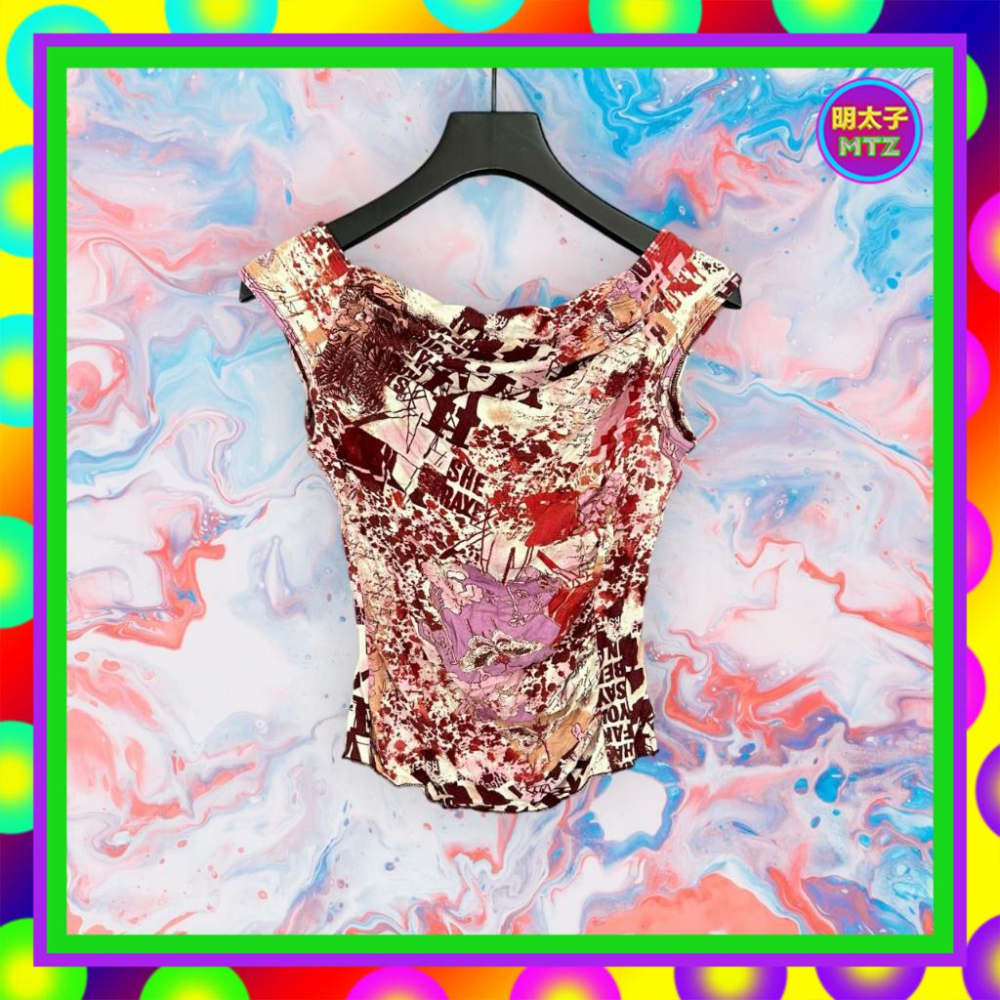 二手 AXARA 紅咖米配色 印花 輕薄 彈性 拼接 抓皺 垮領 背心 F731 【明太子 古著應召站】
