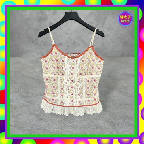 二手 CHAVANA 米咖配色 彩色印花 輕薄 微挺 微透 蕾絲 略彈性 排釦 背心 F720 【明太子 古著應召站】