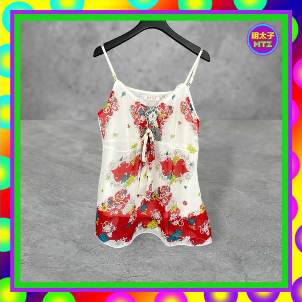 二手 BANK 米白紅配色 薄紗飄逸 彩色印花 拼接 蕾絲 抓奶皺 傘狀 側拉鍊 背心 F713 【明太子 古著應召站】