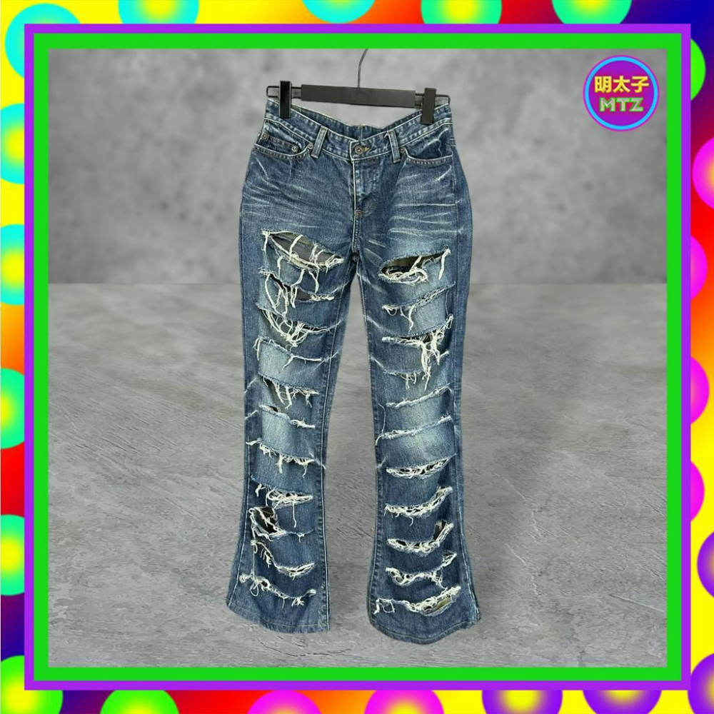 二手 BLUE WAY 藍色 牛仔 口袋 小喇叭 大面積破洞 低腰 28 長褲 PF515 【明太子 古著應召站】