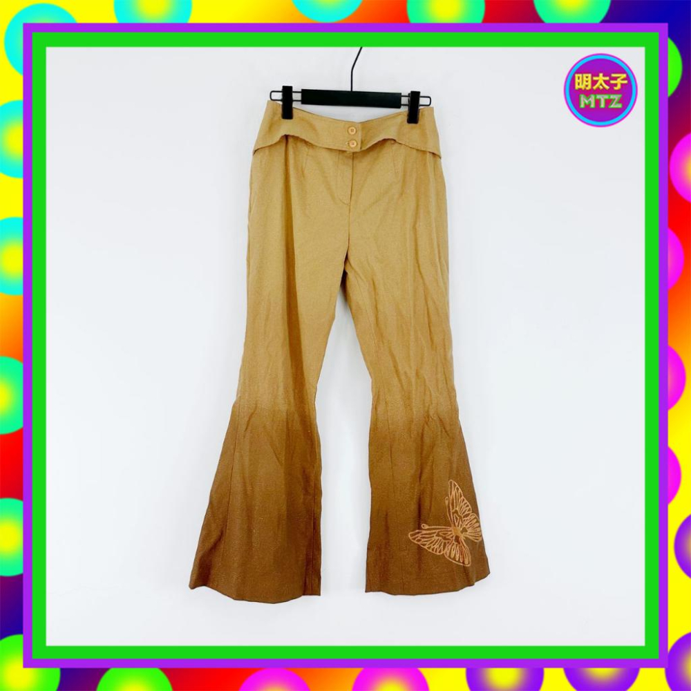 二手 BIGI 棕咖 略硬挺 閃耀 彈性 蝴蝶印花 腰飾 大喇叭 低腰 28 長褲 PF303 【明太子 古著應召站】