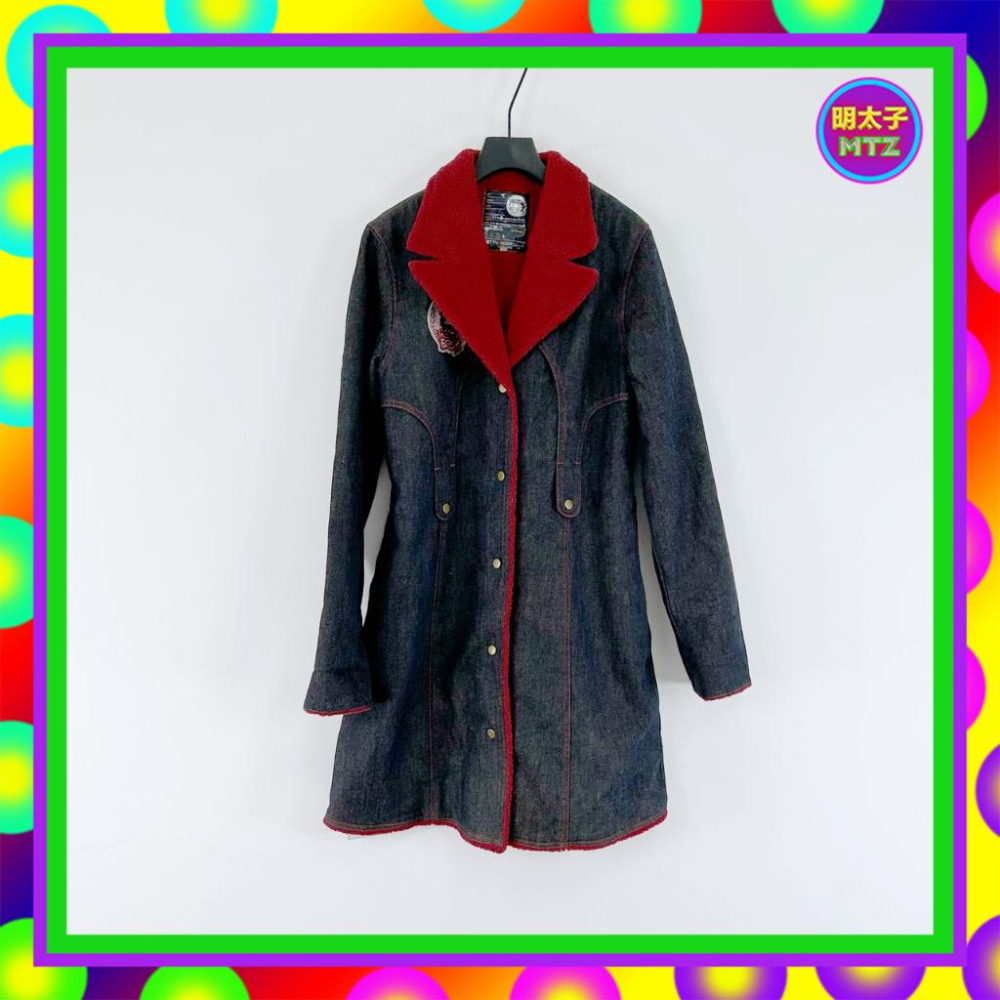 二手 貝蒂噗 黑藍紅配色 牛仔 內刷毛 厚 口袋 刺繡毛圖案 外套 大衣 MF15 【明太子 古著應召站】
