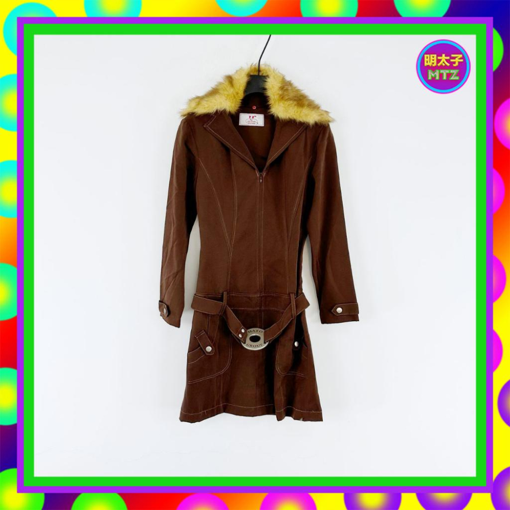 二手 HER HIM 咖啡色 微挺 上拉鍊 可拆毛領 附金屬頭腰帶 長袖 洋裝 F130 【明太子 古著應召站】
