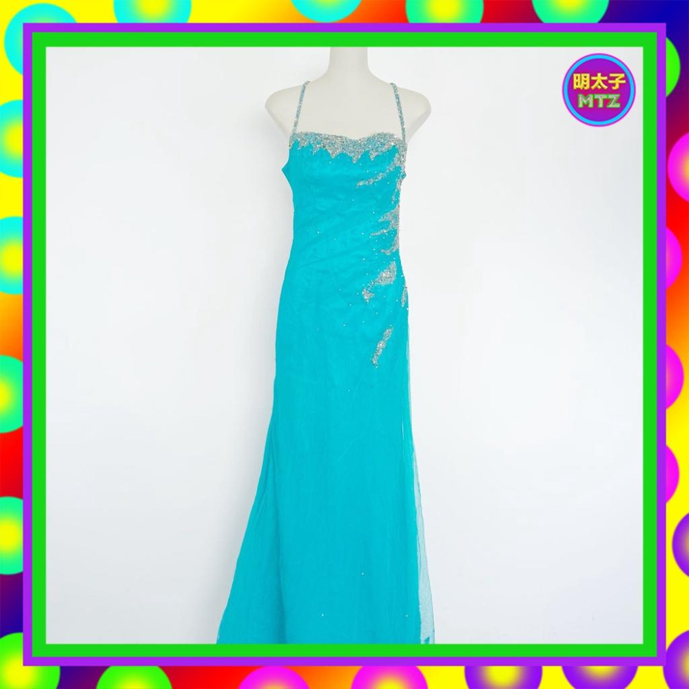 二手 藍色 細網 珠飾 亮片 禮服 壓褶 禮服 繞頸 洋裝 E1212B 【明太子 古著應召站】