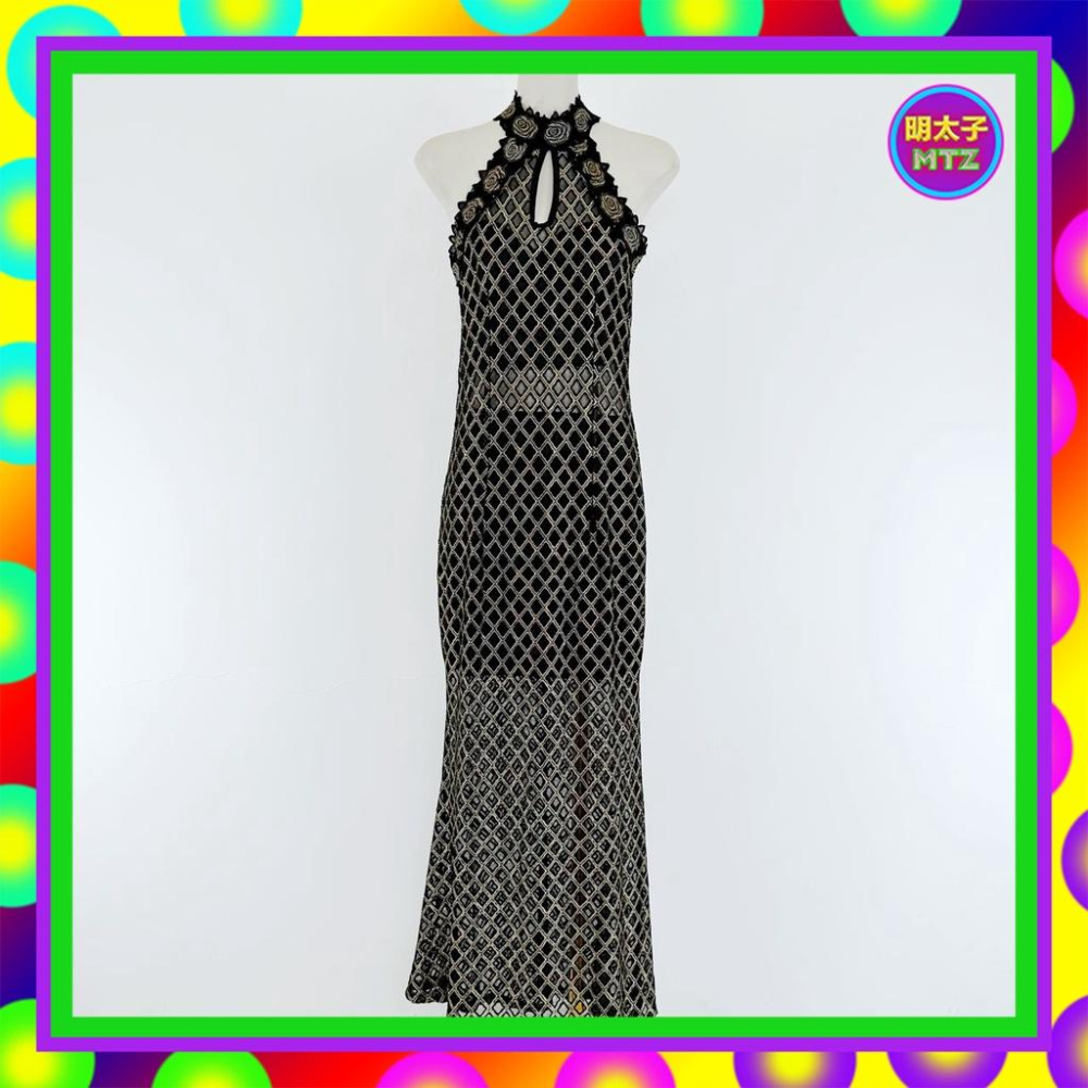 二手 黑金配色 細網 織紋 輕薄軟 微彈性 拼接 蕾絲 削肩 微魚尾 合身 洋裝 E1128 【明太子 古著應召站】