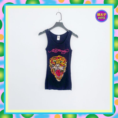 二手 ED HARDY 黑色 輕薄軟 老虎 彩色印花 貼鑽 高彈性 緊身 背心 E703 【明太子 古著應召站】