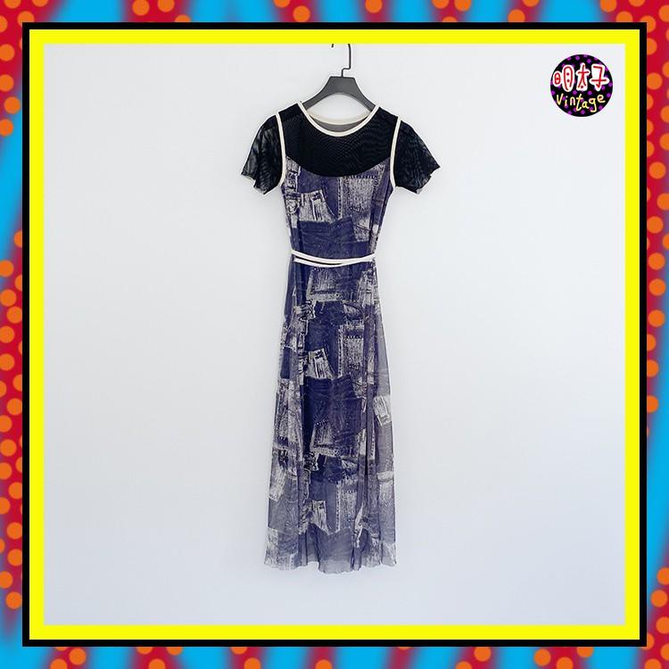 二手 黑灰藍配色 假兩件 網布印花 拼接 彈性 無拉鍊 腰綁帶 短袖 洋裝 D916 【明太子 古著應召站】