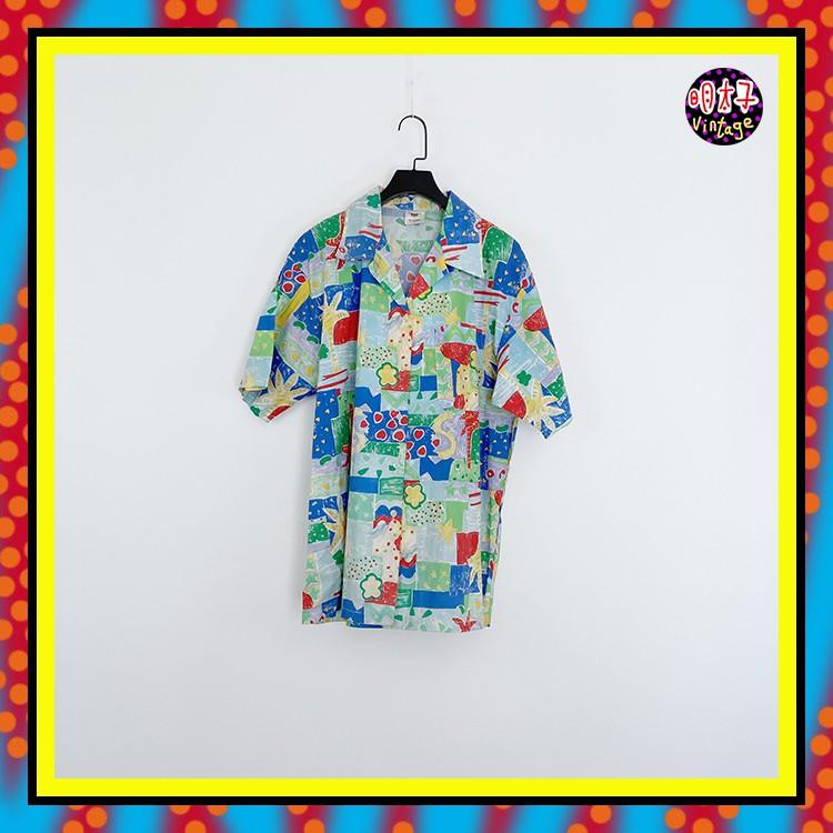 二手 藍彩色 印花 口袋 短袖 襯衫 D609 【明太子 古著應召站】