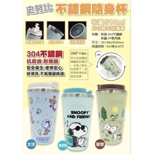 台灣授權正版百貨 不鏽鋼隨身杯-史努比 SNOOPY PEANUTS正版授權 【款式】野營/音樂/太空 【尺寸】約16.8x9cm 【容量】510ml 【耐熱溫度】6hr≥40℃ 【材質】杯身:304不鏽鋼、蓋子:PP 聚丙烯 【產地】中國(台灣監製) 超實用史努比直飲咖啡杯 簡約美觀❤️ ☕杯蓋飲口密封設計:密封緊實 攜帶方便 ☕光滑杯口:杯口拋光,旋擰順暢,易清洗 ☕304不鏽鋼材質:品質安心更健康 ☕特殊防滑墊設計:防滑牢固,杯底不易磨損 *隨身攜帶尺寸。 *瓶身磨砂質感,握感舒適。 *史努比人氣居家生活商品。 *正版授權,安心購買。