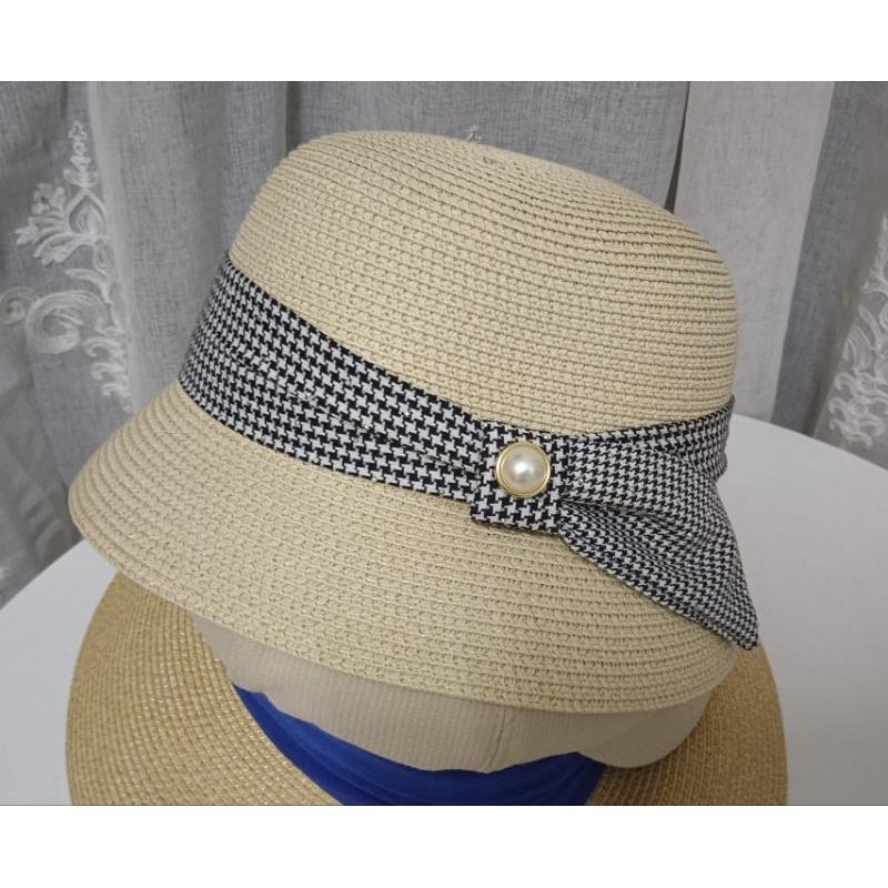 全新 淑女風格 草帽 千鳥格緞帶 可調頭圍