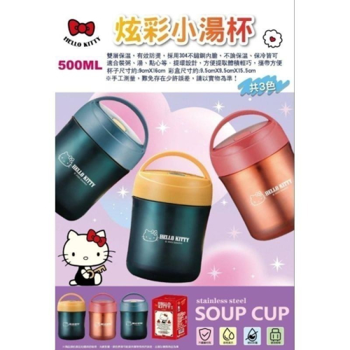 KT 炫彩小湯杯 三麗鷗 Hellokitty 尺寸:9x16cm 盒裝尺寸:9.5x9.5x15.5cm 材質:304不鏽鋼 耐熱:-20~90℃ 容量:500ml 款式:3色 定價200元