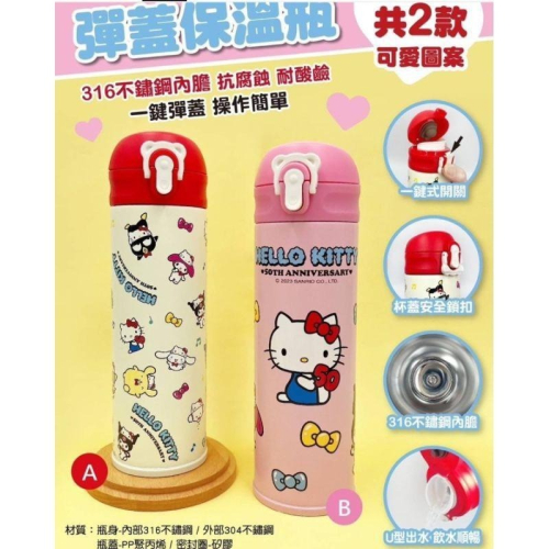 Hello Kitty彈蓋保溫瓶 316不鋼鋼內膽 抗腐蝕、耐酸鹹 一鍵彈蓋 操作簡單 杯蓋安全鎖扣 鍵式開關 ※在室內溫度23C環境下,給保溫杯中盛裝9C熱水密閉靜置6小時後,杯內溫度保持在60C以上,盛装4C冷 水,密閉靜置6小時後,杯內溫度保持在11C以下。 U型出水飲水順暢 建議售價799元