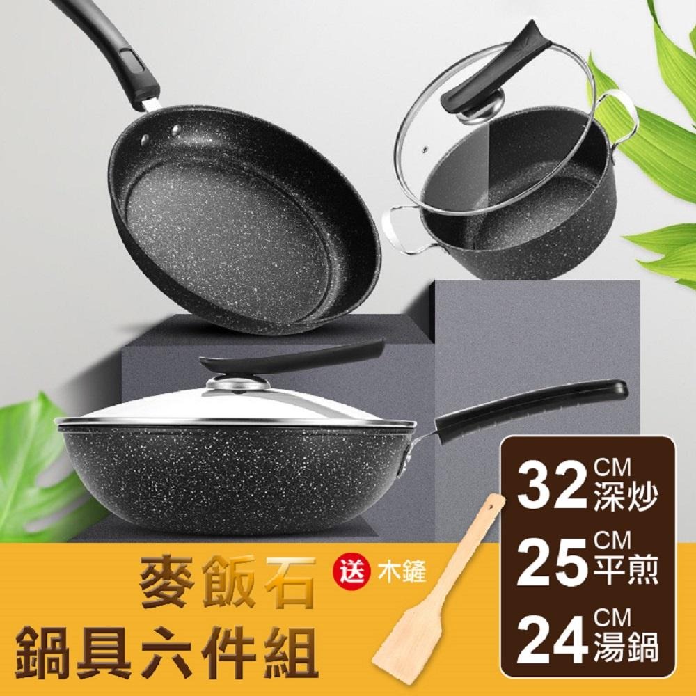 麥飯石不沾鍋6件套 深炒鍋+鍋蓋+煎鍋+鍋鏟+湯鍋+鍋蓋 24/25/32CM炒菜鍋 平底鍋 全能鍋 各種爐灶通用 現貨