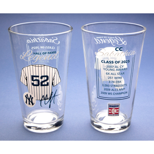 這款專屬客製化球員啤酒杯 是粉絲絕不能錯過的收藏品!杯身一側印有 CC Sabathia的球衣圖樣與複製簽名,另一側則展示了他輝煌的生涯數據與成就。