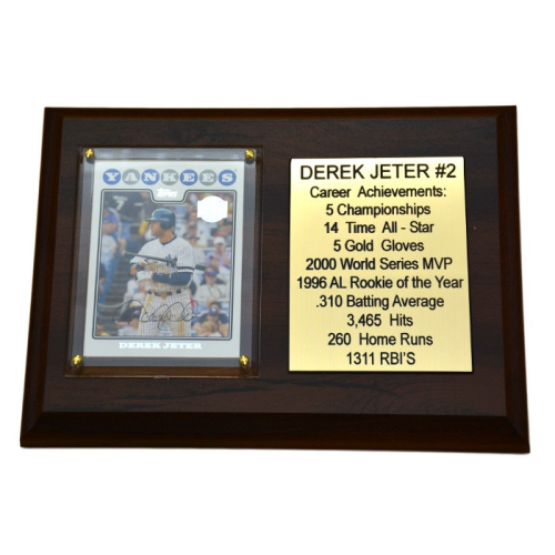 洋基傳奇隊長 Derek Jeter 致敬,這款美製紀念匾選用 櫻桃木質感底板,尺寸約 15.2cm x 20.3cm,內含一張精選球員卡(每件隨機但皆為 Jeter 本人),搭配 雕刻名牌與生涯紀錄,完整呈現他輝煌的棒球旅程。