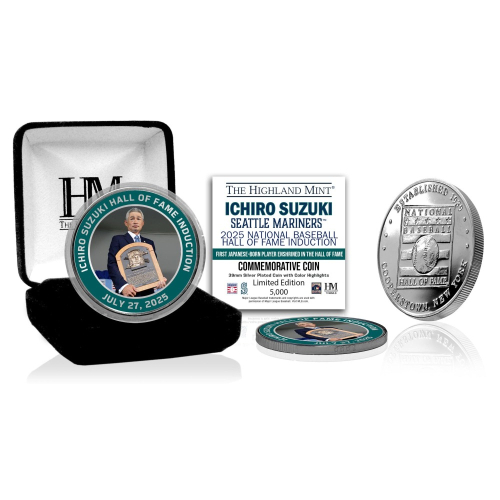 紀念鈴木一朗傳奇職業生涯,這款精緻的39mm鍍銀紀念幣以彩色設計突顯其2025年入選美國棒球名人堂的榮耀。正面為鈴木一朗手持名人堂獎牌的全彩圖像,背面則鑄有名人堂徽章。每枚紀念幣皆於邊緣刻有獨立編號,並封裝於透明保護殼內,附有認證書並收納於黑色絨面珠寶盒中。限量發行5,000枚,作為首位入選美國棒球名人堂的日籍球員,這款紀念幣極具收藏價值。由美國 The Highland Mint 精製,並獲美國職棒大聯盟官方授權。