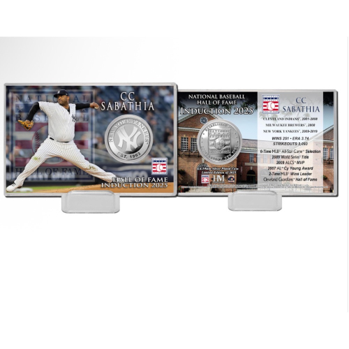 慶祝 2025 年入選名人堂的 CC Sabathia 傳奇生涯,這款來自 Highland Mint 的紀念入堂硬幣卡是專屬收藏佳品。硬幣正面刻有球員所屬 MLB 球隊標誌,背面印有美國棒球名人堂標誌,並附有壓克力保護殼與球員影像、數據與成就的插頁卡。