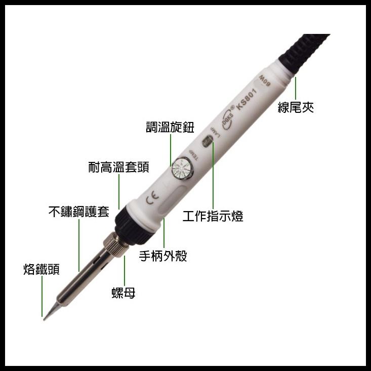 尺寸:229mm(不含電線) 電源線長度:約150CM 輸入電壓:110V 耗電量:15-60W 調溫範圍:一般款300-480℃ 淨重:約100G *永不退色掉字* 物件上的字體使用雷射刻字,色澤鮮艷長期使用不退色 *耐用發熱芯* 溫度穩定升溫速度快 發熱芯採用PTC精密印刷技術 具有溫度穩定,升溫回溫速度決 插拔式設計,維修更換方便簡單 *亮度漸變工作指示燈* 工作狀態清晰明了 採用透明顯示面口設計,透光效果更好 隨溫度高低調節指示燈亮度漸變 醒目的紅色工作指示燈 *200-480度溫度調節* 無極調溫設計控溫精準 200-480度寬範圍無極調溫設計 60W足功率適應不同焊接場合 華氏和攝氏度刻度指示方便調控溫度 *體積小功能強大* 小身材大用途 採用輕巧型結構和電子設計,重量低於100克 手感好,重量輕,長期使用不易疲勞 焊接使用效率遠超普通焊台 直插式即插即用攜帶方便