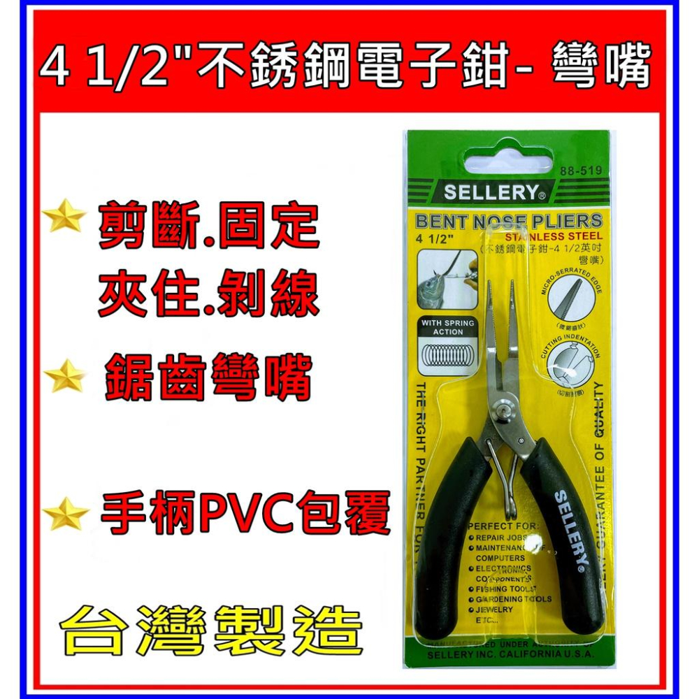 [買酷小舖] SELLERY 4 1/2"專業不銹鋼電子鉗- 彎嘴 白鐵尖嘴鉗 斜口鉗 剪斷 固定 夾住 舍樂力出品