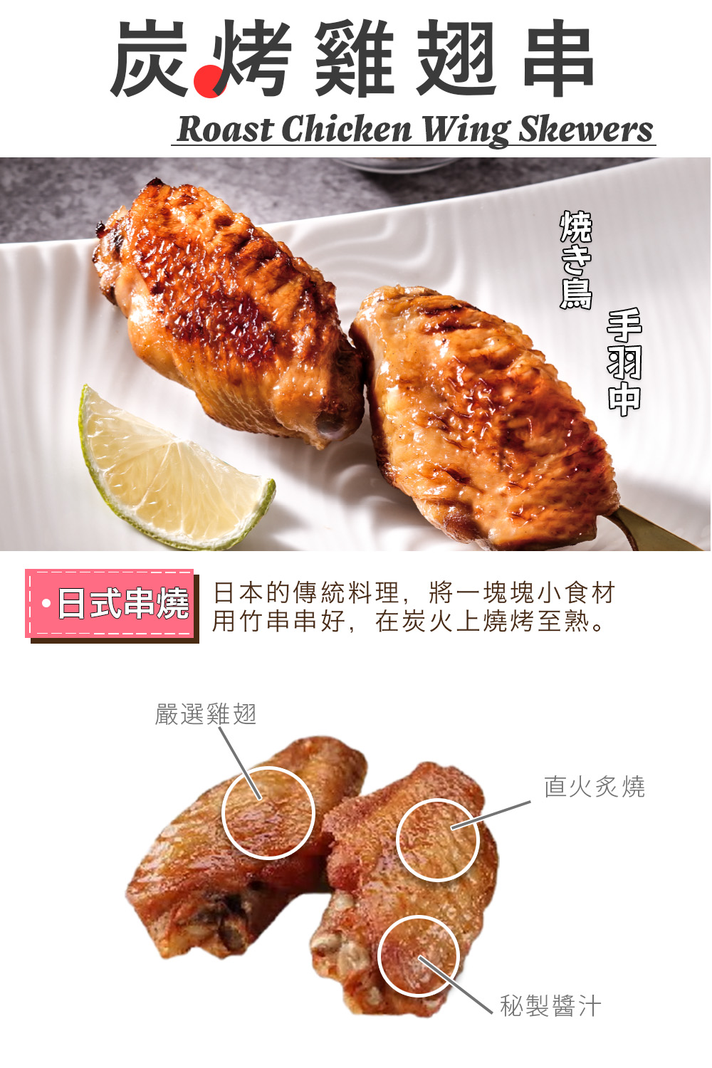 宏益冷凍|炭烤雞翅串40串/10包 (140-160g/4串/包) 🌸日式經典串燒🔥直火炙燒⭐秘製醬汁