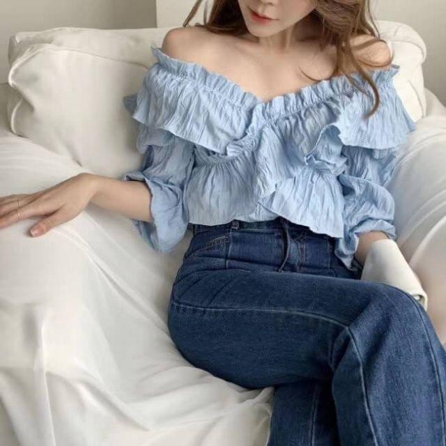 顏色:藍,杏,黑 尺寸:F(S~小L) 材質:纖維混棉 ✨交叉荷葉露出香肩的小性感,更增添了浪漫甜美氣質,非常吸睛的單品💓