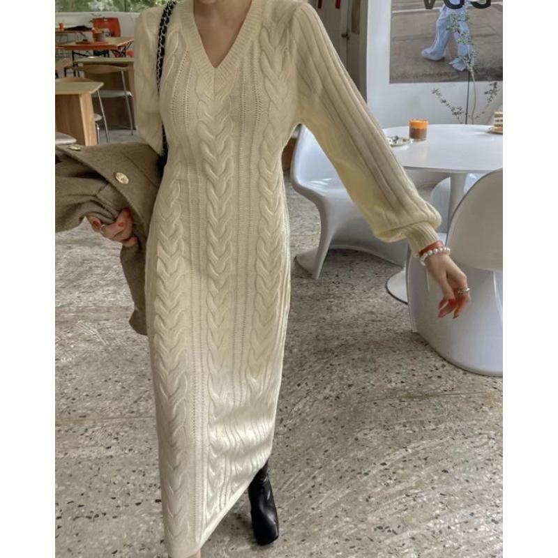 AK韓國連線 麻花v領針織長洋裝 長版針織洋 薄針織 綁帶針織洋裝 長洋裝