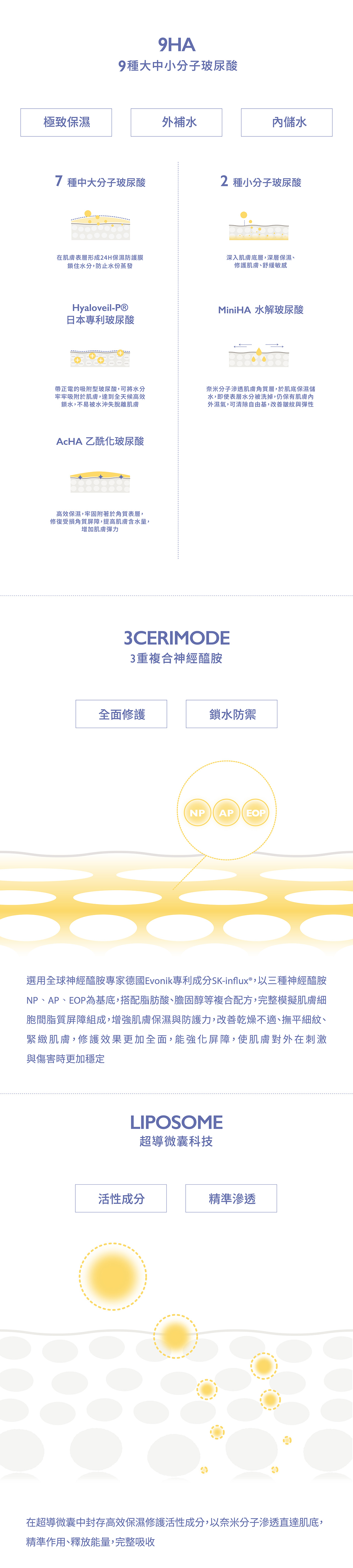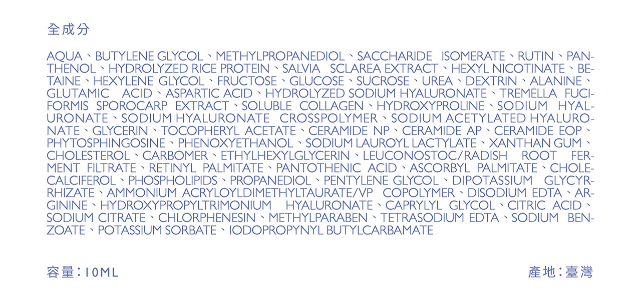 9種玻尿酸、水解稻米蛋白、鎖水磁石、旱地鼠尾草萃取