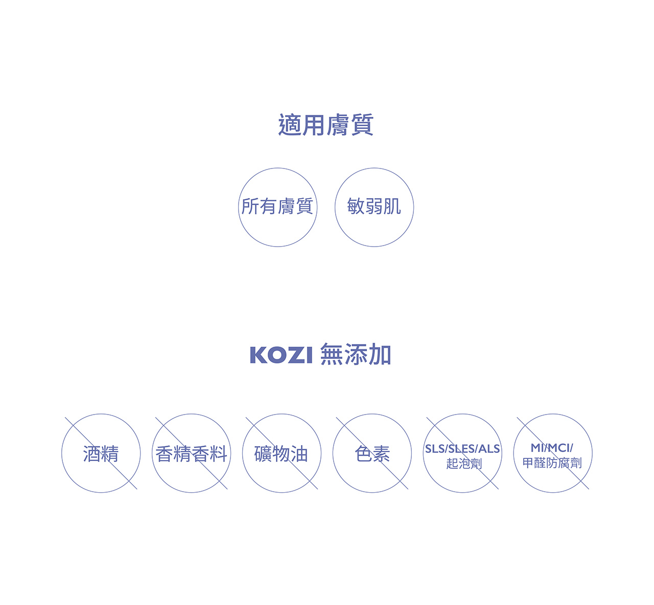 KOZI無添加:酒精、香精香料、礦物油、色素、SLS/SLES/ALS起泡劑、MI/MCI/甲醛防腐劑等致敏成份。