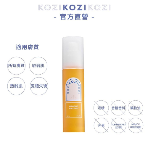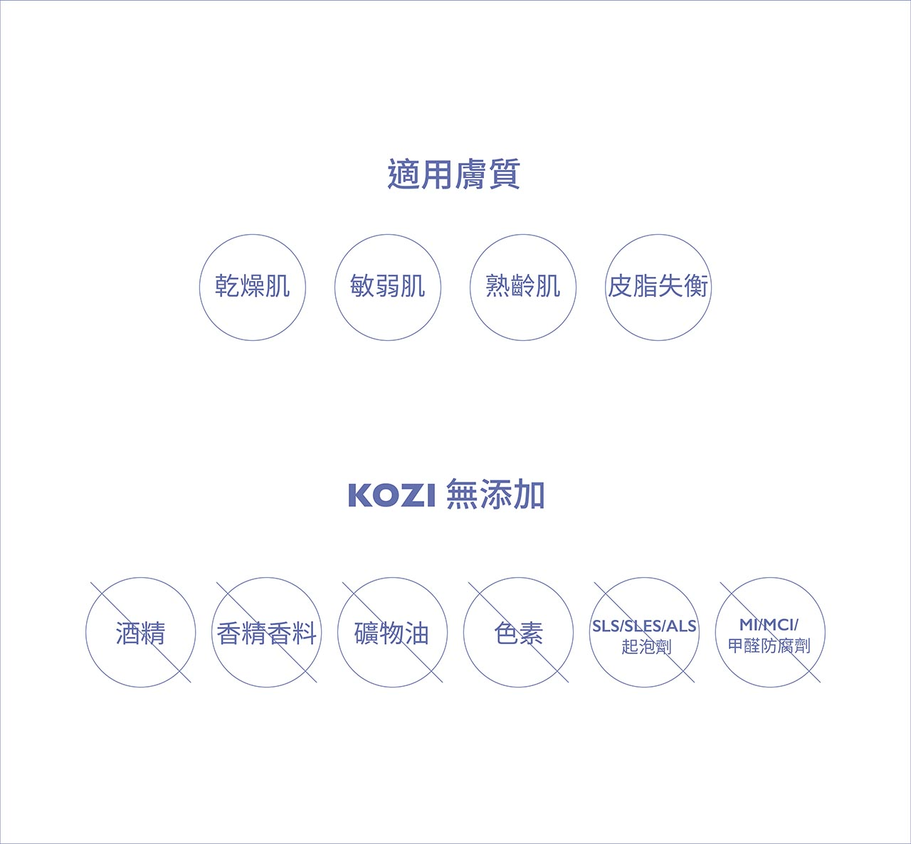 KOZI無添加:酒精、香精香料、礦物油、色素、SLS/SLES/ALS起泡劑、MI/MCI/甲醛防腐劑等致敏成份。