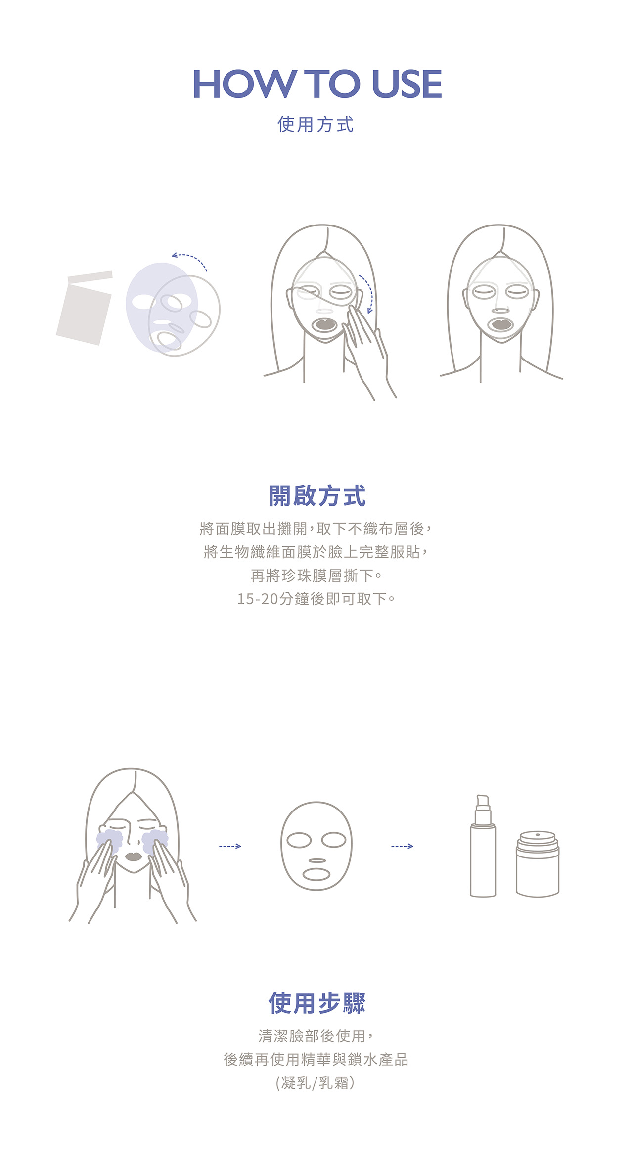 最佳厚度生物纖維面膜,完整服貼,外層補水,內層鎖水,全方位保濕潤澤。