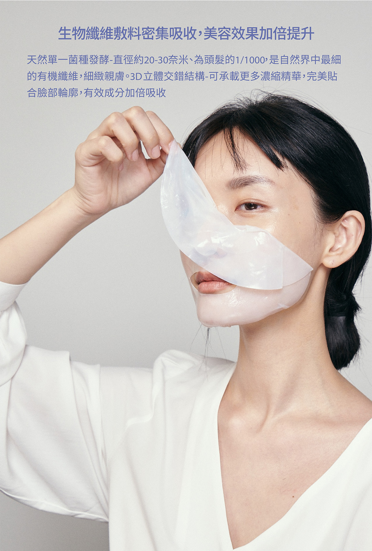 能使精華成分深入肌底,經過高度潔淨處理的單菌生物纖維膜更不易產生過敏,