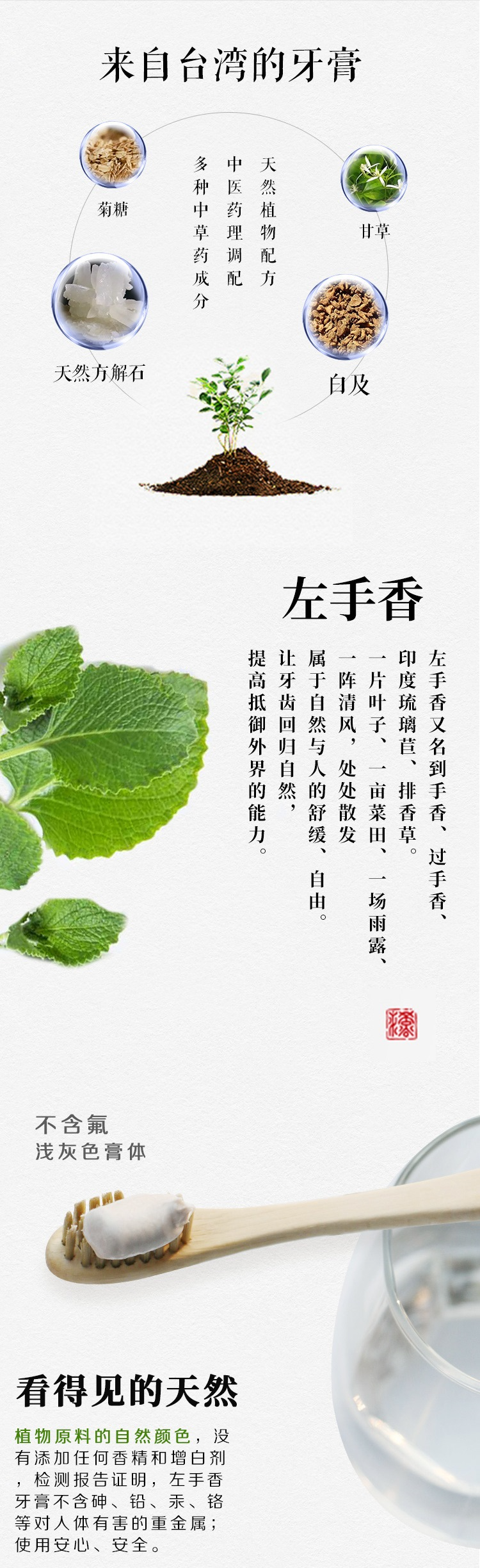 主要成分 : 左手香、白芨、甘草、薄荷、海藻膠等。