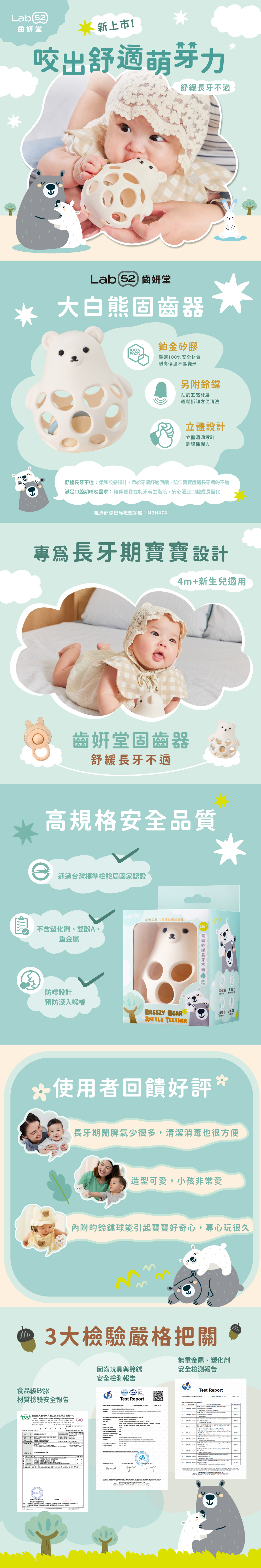 柔韌硬度不傷害嬰幼兒嬌嫩牙床,符合人體工學的設計,附有鈴鐺,有助於五感發展。可拆洗設計,落實使用後的消毒。