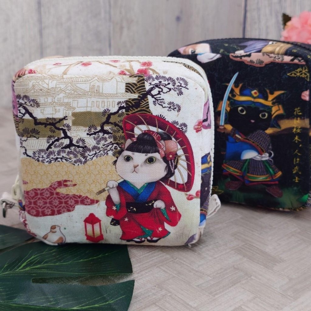 日系 江戶武士貓 方形拉鍊收納包 可拆式手腕帶 手作小物包 行動電源包