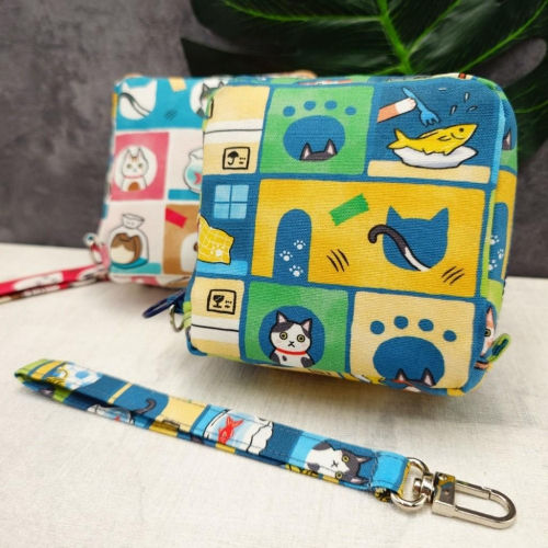 格子小貓 方形拉鍊收納包 可拆式手腕帶 手作小物包 行動電源包