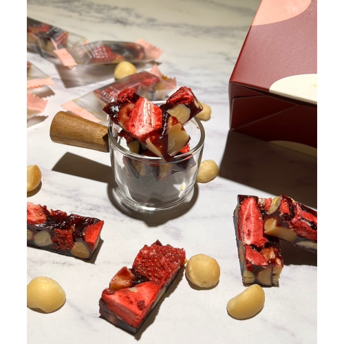 水麥芽、海藻糖、上白糖、覆盆子果泥、草莓果泥、法國發酵奶油、4LL夏威夷豆、義美草莓凍乾
