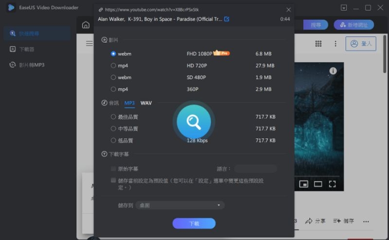 有時,您可能只需要影片的聲音部分,怎麼將影片聲音分離?通過EaseUS Video Downloader將影片下載為MP3格式,就能從影片提取音頻。此外,還提供了320kbps、256kbps和128kbps的音頻品質可供選擇。