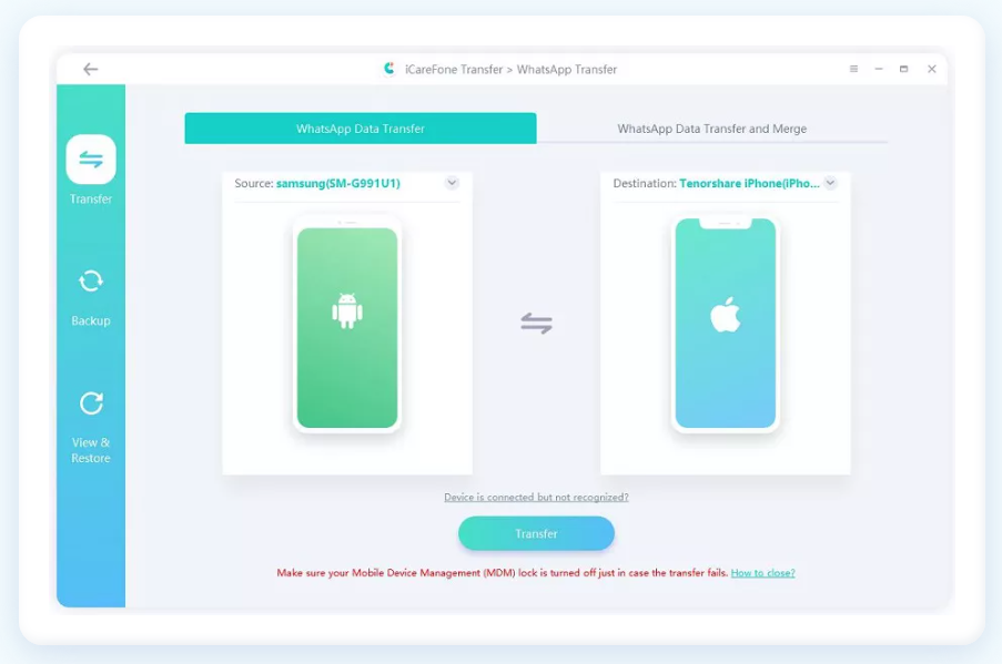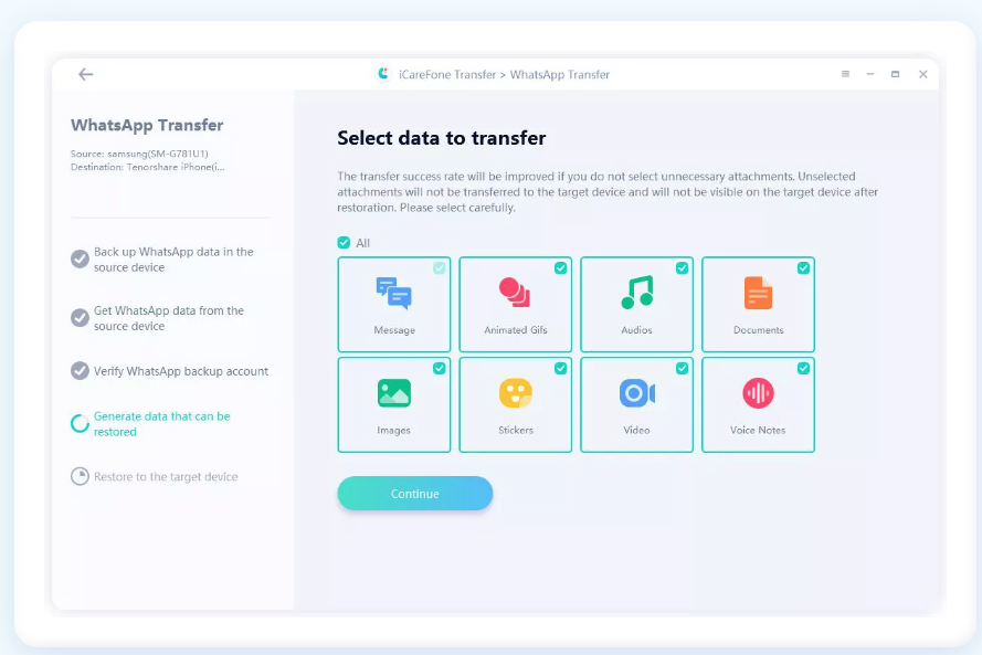 如果不想要依賴 WhatsApp 內建的雲端備份,可以選擇 iCareFone Transfer 來備份,備份功能完全免費, 且可以用此工具跨系統還原備份檔。