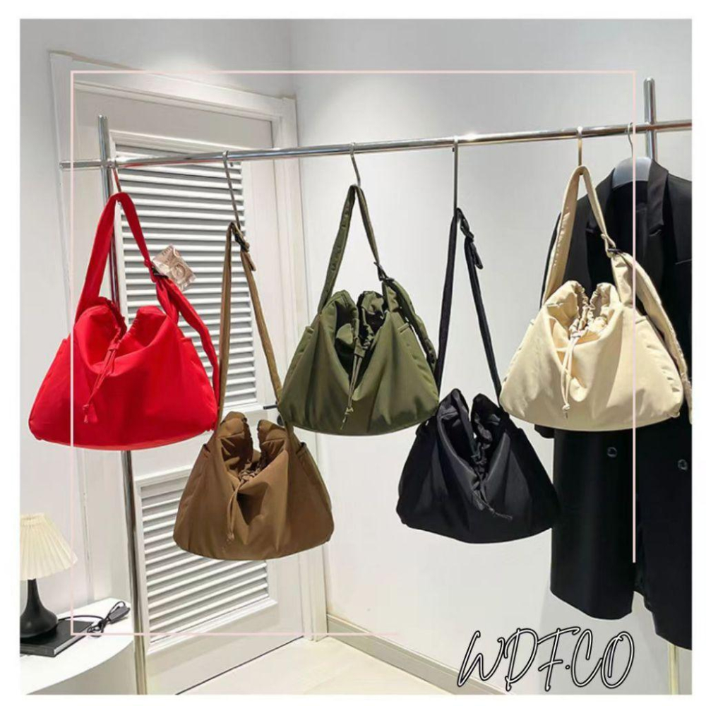 WDF.CO現貨│2025新款尼龍布餃子包│紅米棕綠黑5色束繩大容量托特包│肩帶可調│單肩斜背空氣包|通勤包|