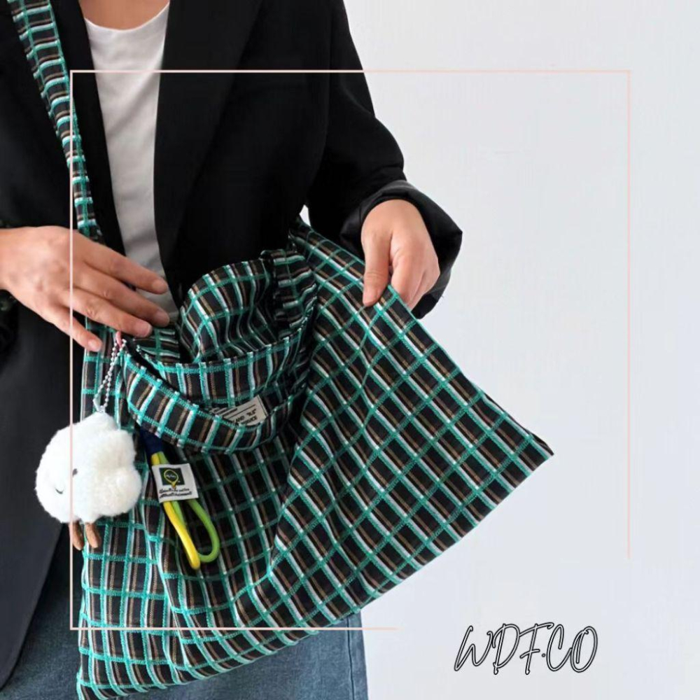 WDF.CO現貨│2025韓國東大門純棉藍綠格紋購物袋│附贈雲朵吊飾掛件│雪尼爾提花色│單肩包|容量大|有磁紐|外出包