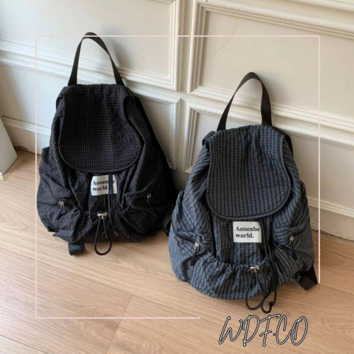 WDF.CO現貨│2025韓系新款尼龍運動格子風後背包│ 黑灰2色抽繩多口袋雙肩包│超大容量│防潑水│外出旅行包