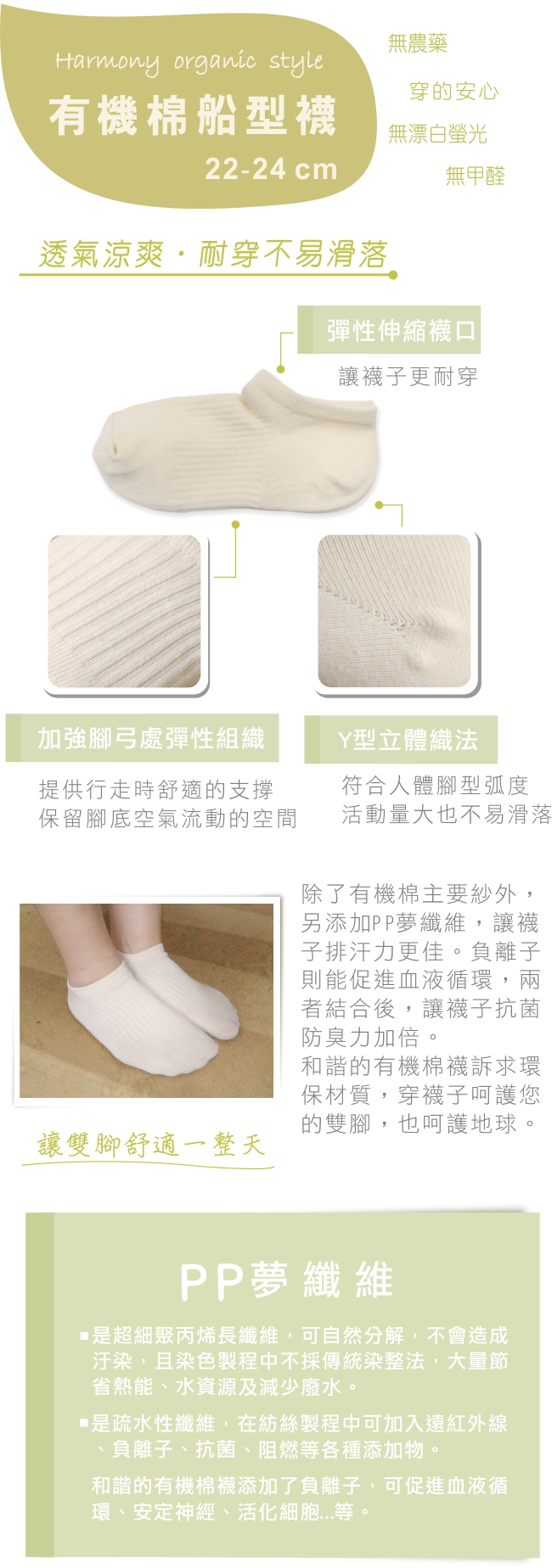 》PP夢纖維的添加,讓襪子排汗力更佳,負離子則促進血液循環,加上有機棉紗線的結合, 讓襪子抗菌防臭力加倍,吸濕透氣排汗力佳,動靜皆宜,最佳的足部保養。