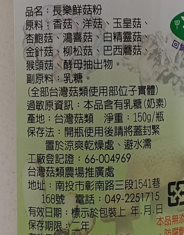 原料:香菇、洋菇、玉皇菇、杏鮑菇、鴻喜菇、白精靈菇、金針菇、柳松菇、巴西蘑菇、猴頭菇、酵母抽出物。
